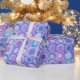 wrapping paper in repeating pattern of abstract squares and blobs, blue and lavender color tones