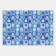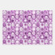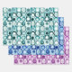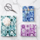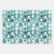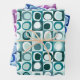 wrapping paper in repeating pattern of abstract squares and blobs in solid colors teal blue magenta
