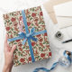 Premium wrapping paper featuring a repeating retro pattern of red Christmas bulbs with ribbon accents, holly bows, and golden sleighs on a cream background—perfect for classic holiday gift wrapping.
