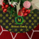 Christmas product that has white snowflakes and a colored background. A green wreath with your monogram initial. Below is a place to add your name. Make the changes when you Personalize this template. To make more changes, click on Customize it further.