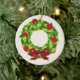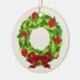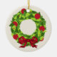A Christmas ornament featuring an illustration of a wreath made of holly leaves decorated with red ornaments and a bow.