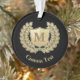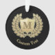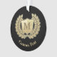 Wreath and shield icon. Custom background color. Custom monogram. Custom text on both sides.