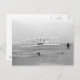 Wright Flyer - One of the first flights, 120 feet in 12 seconds, 10:35 a.m.; Kitty Hawk, North Carolina. Orville Wright at the controls of the machine, lying prone on the lower wing with hips in the cradle which operated the wing-warping mechanism. Wilbur Wright running alongside to balance the machine, has just released his hold on the forward upright of the right wing. The starting rail, the wing-rest, a coil box, and other items needed for flight preparation are visible behind the machine.