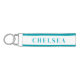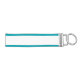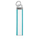 Wrist band keychain is shown in a teal color and white with a custom sample name.