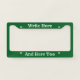 You can edit the text to write a custom message. This dark green license plate frame has two lines of white display text.
