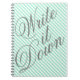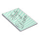 A notebook with a lovely script font for all those things you need to write down and hold on to. Shown here with an aqua and white striped background and gray font color.
