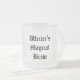 Our misty-frosted version of our Writer's Magical Brew mug. Bring magic and good luck to your writing, or to a friend's as a writer's gift, with this writer's tea or coffee (or witches' brew) mug. Whether your writing concoction contains pick-me-up caffeine, calming chamomile, cider, soda, or even lunchtime soup sipped at your writing desk, the crisp black ancient lettering can't help but inspire. And your brew will show through the misted glass. The text has been put in a special template to make it easy for you to change the words to your own if you choose. (When you go to the ordering page, you can change the mug design to many other sizes, colors, etc. with an easy click.)