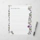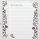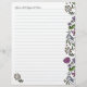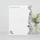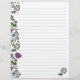 Floral illustrated, lined writing paper. Large size (8.5 x 11) paper with hand-drawn, little flowers and leaves along the edges. Personalize with a line of text at the top on one side. Sample wording is, "Here's what happened today..." in a handwritten font. The whimsical design is done in green, purple and yellow and is on opposite edges on each side of the paper. Use to write any correspondence, add to a diary or junk journal, or punch holes and add to a scrapbook binder.