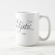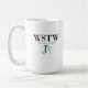 This is a mug with the WSTW initials on it along with the book title, Mystic and the girls' names: Bronya, Lily, Shelia, Melody, Coralie, and Markaza. Women Save the World!