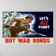 This vintage World War II poster features factory workers and a soldier charging into battle with his rifle. It declares, "Let's all fight! Buy War Bonds!" Celebrate American and WW2 History with this digitally restored vintage war poster product from The War Is Hell Store.