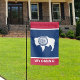 The Wyoming State Flag features a dark blue field bordered by white and red. In the center, there is a white silhouette of a bison with the state seal. Because this flag is double-sided, the back has been adjusted so that the buffalo faces the flag pole end and the state seal is readable. Facing horizontally with the name, Wyoming in white below.