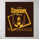 Wyoming's design features an illustration of two six-shooters and a cowboy atop a bucking bronco forming a "W", both illustrations representing the wild west/cowboy style Wyoming proudly portrays. Also included is typography reading the state's nickname, the "Cowboy State", with Wyoming's statehood year atop the typography.
