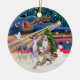 Three Whippets are the focal point of this charming design featuring some of the major symbols of Christmas – the three wise men, the star of Bethlehem, a decorated Christmas tree, a snowman, a dove of peace and Santa and his reindeer flying through the star studded night sky.