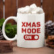 This is a must coffee mug for holidays—Xmas Mode On red typography and Christmas tree.
