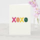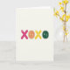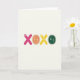 This greeting card shows the letters “XOXO” stretched across a creamy white background in a simple, graphic style. The first “X” is deep magenta with a small white heart inside, plus a few thin white lines that add a gentle, cozy touch. Next comes an orange “O” that looks like a round patch, decorated with tiny white hearts and little cross marks, with a dashed outline around the edge. The third character is a sunny yellow “X” with a small emblem in the center that mixes simple shapes, giving it a fun, interesting look. The last “O” is forest green and matches the patch-like dashed border and small white symbols seen on the orange one. “XOXO” reads clearly from left to right, and the letters are thick and rounded, with the small white details standing out against the color. It feels meaningful to give because it says hugs and kisses in a direct, friendly way, perfect for romance or a close friendship 🥰❤️. Hope it helps you share your Valentine’s Day sentiments.