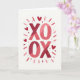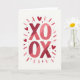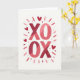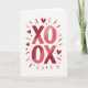 This greeting card features a large “XOXO” in the center, stacked with “XO” on top and “OX” below. The letters look like they were brushed on, with reds that shift from deep crimson to softer rose. Small white speckles sit across the letters, like light snow or tiny sparkles, giving the design extra texture. Around the main word, little hearts and quick paint-like strokes spread outward in pinks and reds, almost like a burst around the message. Some hearts are darker and solid, standing out as simple reminders of love. The off-white background keeps the focus on the message and makes the reds and pinks feel warm and close. The “XOXO” text is thick and easy to read, placed right in the middle so it feels direct and sincere 🥰❤️.