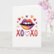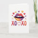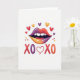 This greeting card shows a pair of open lips in the center, shaded from deep purple at the corners into red and then a warm orange-yellow toward the middle. The lips look glossy with small highlights, and a bit of white teeth shows inside, giving a flirty, friendly expression 🥰. Around the lips, hearts float outward in red, yellow, and purple, in different sizes so the whole scene feels lively. Near the bottom it says “XOXO” in thick, rounded letters, mixing orange, purple, and red tones that match the artwork. One of the “O” letters is replaced by a red heart, drawn simply so the message reads clearly as hugs and kisses ❤️.