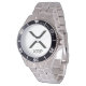 Has heft and feel of expensive stainless steel quartz watches. Good band with safety catch. I removed links, which is easy because engraved arrows show direction to push the linking pins. As always by this seller, the image (a railroad logo) is a perfect reproduction of my emailed image, and is precisely spaced and aligned.