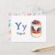 "Letter Y is for Yogurt" in our Alphabet Flash Card set. Get all 26 letters of the alphabet! A double-sided postcard that is great for memory games and teaching, geared for education, schools, teachers and homeschoolers for kindergarten and babies. All text is editable if you need to customize.