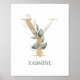 Letter Y monogram floral. Letter Y in golden brown texture accented with green watercolor compound leaves, flower blossoms and gold dust. Personalized with name in matching font.