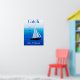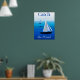 Poster art of yachts at sea, with the phrase "catch the wind", on a cobalt and cerulean blue ocean background