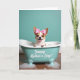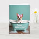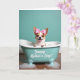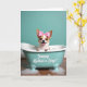 This card features a small happy dog peeking out of a tiny teal bathtub, its dark eyes shining and its open grin giving the scene a friendly, affectionate feel ❤️. A bright pink bow with white polka dots sits between its perky ears, like it’s dressed up for someone special. The tub is a soft aquamarine shade and packed with fluffy white bubbles, with a few suds sliding over the rim as if the pup just splashed around. Below the tub, a warm wooden floor adds a cozy, homey setting that suggests a sweet little moment shared with care. The background is a smooth teal field that keeps the focus on the dog and bath, while the lighting stays gentle and sunny. On the front of the bathtub, the phrase “Yappy Mother’s Day!” appears in white lettering, centered and easy to spot 🌼. The bubbles look glossy and airy, scattered around the rim and drifting down toward the floor in small foamy clusters.