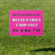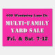 Yard sale roadside, rectangular sign in hot pink. Bold white and black text is easy to customize in four lines. All text will print the same on both sides. Include the location - street address - at the top. "Muli-family Yard Sale" could also be, "Moving Garage Sale" or similar that fits the space. At the bottom include the days, dates, times or other. This sign is 18 x 24 inches or choose the large size as needed. This sign is easy to reuse for the same address.