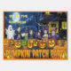 A vibrant yard sign invites guests to a festive pumpkin patch party, showcasing playful characters, a spooky ghost, and cheerful children among carved pumpkins. Perfect for Halloween celebrations., inviting trick-or-treaters to go to the side door for their treats at night.