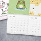 A 12 months Calendar with seasonal illustrations: a cute cow on cover, a snowy landscape with a bullfinch for January, a lemon and orange pattern for February, an outer space decor for March, a rainbow for April, a cute frog for May, a spring landscape with flowers and mountains for June, a BBQ for July, bees and honeycombs for August, a fall pattern for September, a Halloween decor for October, a lighthouse for November, a Christmas Nutcracker for December and a cute hippo on the back.