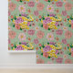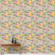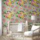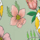 A Yellow Albino Ball Python is coming around pink and peach roses in a backdrop of teal.