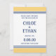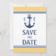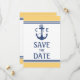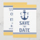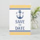 Yellow and navy blue save the date announcement with monogram heart anchor.