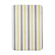 A modern white bathmat with yellow and gray stripes.