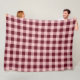 This fleece blanket features a dark and light red plaid