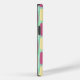 This phone case has a geometric design of made of a background of sea-green and light blue rectangles with yellow and pink ovals on top.