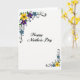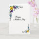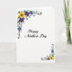 This card features the words “Happy Mother’s Day” centered in flowing black lettering, set against a bright white background. The message sits comfortably in the open space, giving it room to breathe while still feeling close and caring, like a gentle note shared with ❤️. In the top-left corner, a floral cluster leans inward with sunny yellow blooms, deep purple petals, soft blue flowers, and fresh green leaves, as if reaching toward the greeting. Thin black curling lines trail from the flowers and loop gracefully around the corners, adding a light, romantic touch without crowding the text. In the bottom-right corner, a smaller matching bouquet echoes the same colors and angles back toward the center, creating a quiet sense of connection across the page 🌼. The diagonal placement of the two arrangements frames the words like a tender embrace, guiding the eye from one corner to the other and back to the message. The black lettering remains the darkest element, standing out clearly while the florals add warmth and gentle companionship. The upper-left bouquet is larger and more detailed, while the lower-right bouquet is smaller, with the same curled black accents threading around its leaves.