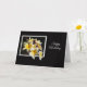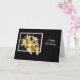 A note card with a yellow and white frangipani in a white frame with black background. Card reads happy birthday in a white fancy font.