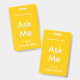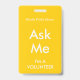Bright yellow "Ask Me" badges for volunteers, teachers, docents, guides, event organizers for special events, such as weddings, craft fairs, home & garden shows, charitable events, business and corporate functions. The typography color is pale ivory which gives this badge a modern look. Easy to customize!