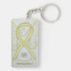The guardian angel keychain features the art of a yellow awareness ribbon angel painting. The key chain has the word "HOPE" and space below to customize with your own personal cause name. The word "HOPE" could also be changed to "CURE". The yellow awareness angel ribbon art keychain can be customized with personalized messages to make great cause keychains for fundraisers, awareness gifts, or other special events or occasions.