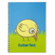 A cute and funny yellow bird cartoon on grass and sky background. Custom text.