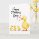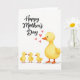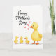 This card shows a large, gentle yellow bird on the right facing three smaller yellow hatchlings lined up on the left, creating a sweet, affectionate moment as they look up at the adult with trusting eyes ❤️. The background is plain white, giving the scene lots of open space and a light, airy feel. Warm yellow feathers are paired with orange beaks and webbed feet, and soft shading adds a rounded, cuddly look to each bird. Behind the adult bird’s head, several small red hearts float upward, adding a romantic, caring touch to the family-like closeness. Near the top left, the message “Happy Mother’s Day” appears in dark lettering, standing out clearly against the white space. The text sits above the birds, balanced so your eye moves from the greeting down to the tender group below 🌼. The three hatchlings are arranged in a neat row with tiny feet and beaks angled toward the larger bird, while the red hearts trail upward in a small cluster behind her head.