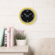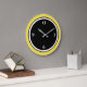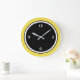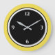 Modern clock features a minimalist design in a yellow color palette with black and white accents. A simple plain design with white numbers on a black background with a yellow border.