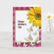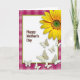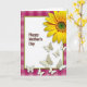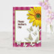 This card features a bright white rectangular panel bordered in soft olive green, set against a fuchsia-and-light-pink plaid background that feels cozy and affectionate ❤️. Centered on the white panel, the words “Happy Mother’s Day” appear in earthy brown lettering that stands out clearly. The strong contrast between the tidy panel and the lively plaid creates a friendly, welcoming scene, like a warm hug in paper form. In the upper right corner, a large sunlit yellow flower leans inward, as if reaching toward the message with gentle care 🌼. Its petals radiate outward, and the center shows a tight spiral of golden orange with touches of deep green for extra texture. Along the lower and right edges, small creamy-white winged insects drift by with fine antennae and soft shadows, giving the design a light, floating motion. A few of these tiny insects angle diagonally near the right side of the white panel, while the flower’s petals slightly overlap the plaid at the top edge.