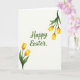Designed with a creamy white background, this Easter card keeps the scene airy and light while letting the floral details take the lead 🌷. In the top right corner, three cup-shaped yellow blossoms drift downward on slim green stems, their soft, watercolor-like edges giving them a gentle, affectionate look. A matching pair of yellow flowers rises from the bottom left, angled upward as if leaning in toward the greeting like close friends. The words “Happy Easter” sit near the center but slightly toward the upper left, leaving open space around the letters for an easy, relaxed feel 🐇. The text is written in flowing green lettering with a lightly textured, painted look that echoes the leaves. Small green leaves tuck around the stems, balancing the corners and guiding your eyes toward the message. The yellow petals are warm and sunny, and the green tones range from deep leaf-green to lighter highlights along the strokes. The top-right flowers cascade diagonally while the bottom-left pair reaches up, framing the green “Happy Easter” text on the creamy white field.