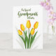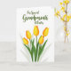 This design shows five stylized spring flowers grouped near the lower half of a white background, their petals shifting from sunny yellow to warm orange like a gentle glow. Slender green stems curve upward from broad green leaves, and the close clustering makes the blooms feel like friends leaning in together 🌷. Behind them, faint pale-gray leaf silhouettes sit like a soft backdrop, adding depth without stealing attention. Above the flowers, a short greeting is placed near the top center in flowing green lettering, with the words spaced to feel airy and calm. The contrast between the crisp white space and the warm petals gives the scene a fresh, affectionate tone, like a quiet note shared between close companions. A small 🐰 emoji can sit neatly near the text or tucked beside a bloom, echoing the seasonal theme without crowding the layout. The overall arrangement keeps the flowers anchored at the bottom while the green message floats above, framed by the subtle gray leaves.