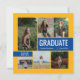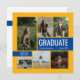 Stylish graduation announcement card and party invitation features six senior photos with "GRADUATE" as a large focal point. Personalize the modern custom text with your grad's name, school, and class year. This two-sided card design includes graduation party invitation wording on the back. Customize the colors of the picture frame and boxes on the front and the boxes on the back to match your school colors or coordinate with the photography. Available in the most popular and common school color combinations - green/yellow, red/yellow, crimson/gold, blue/yellow, navy/gold, black/gold, black/yellow, purple/yellow, red/silver and red/black. Matching products and other colors available.