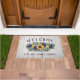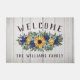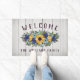 Rustic floral welcome doormat printed with a white wood grain look with welcome written in rustic letters in an arch above a flower bouquet with yellow sunflowers and flowers in blue and berry twigs. Personalize with your last name below.