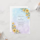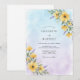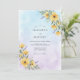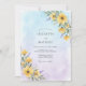 A soft watercolor wash in sky blue and lavender provides a serene backdrop for this design. Vibrant yellow wildflowers, resembling coreopsis, are paired with delicate green foliage and purple sprigs. The overall mood is bright and cheerful, ideal for an outdoor spring ceremony. This artistic arrangement offers a fresh and breezy aesthetic for a nature-inspired theme.
