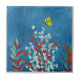 A vibrant, textured digital illustration featuring a whimsical nature scene set against a rich, textured cerulean blue background. The style is modern and graphic, with a heavy emphasis on color contrast and layered textures. A single, bright yellow butterfly is positioned in the upper right quadrant. It is illustrated with a simple black outline and subtle red speckles on its wings, appearing as if it is fluttering toward the plants below.