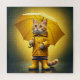 A yellow cat with an umbrella in the rain.