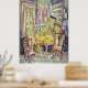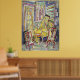 Are we in New York or Paris? The balcony suggests the latter. Is it jazz that will be played, or something from the classical repertoire? A cello is propped against the piano bench. Two ornate Chippendale chairs face us. The palette includes yellow, blues, greens, and purples. White brushstroke lines and black pen lines of acrylic ink define and outline the forms. The artist, Peter Stilton, is internationally known. His paintings and sculptures are in private and corporate collections all over the world…from Tel Aviv to Stockholm, including a commission for the Saudi royal family’s summer palace Peter was the first American to have a one-man show at the Sorbonne (University of Paris).